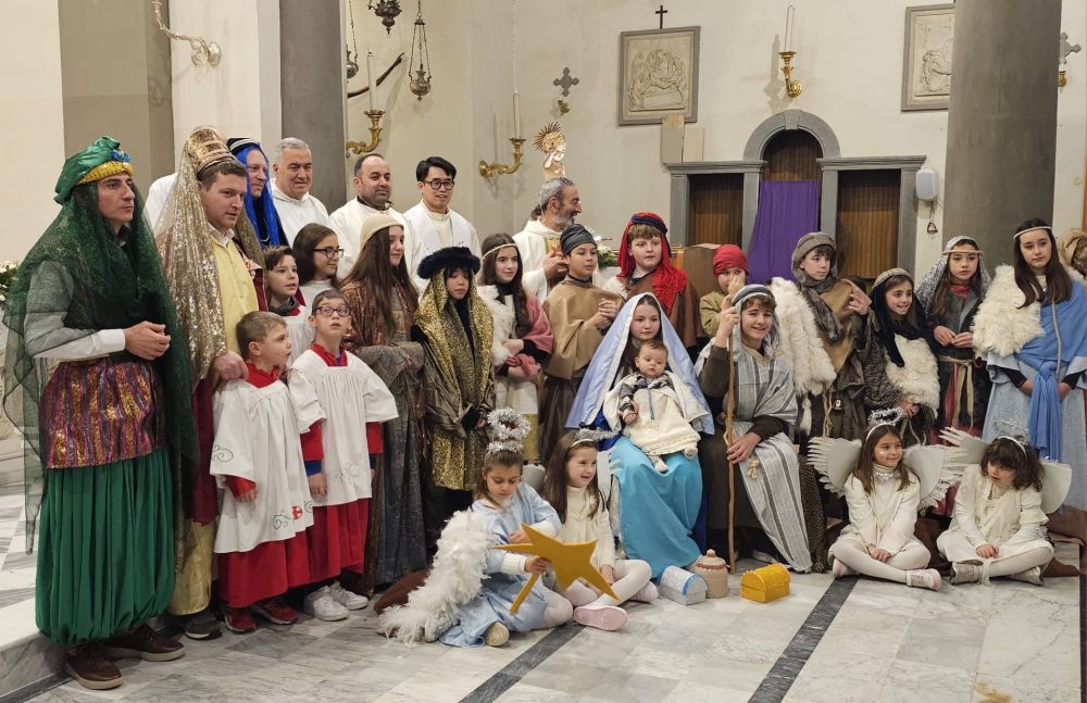 Sono usciti dalla sagrestia in processione, piccoli angeli hanno aperto la scena, seguiti dai pastori e altre donne e uomini dell'epoca, Maria, Giuseppe e Gesù chiudevano l'entrata.